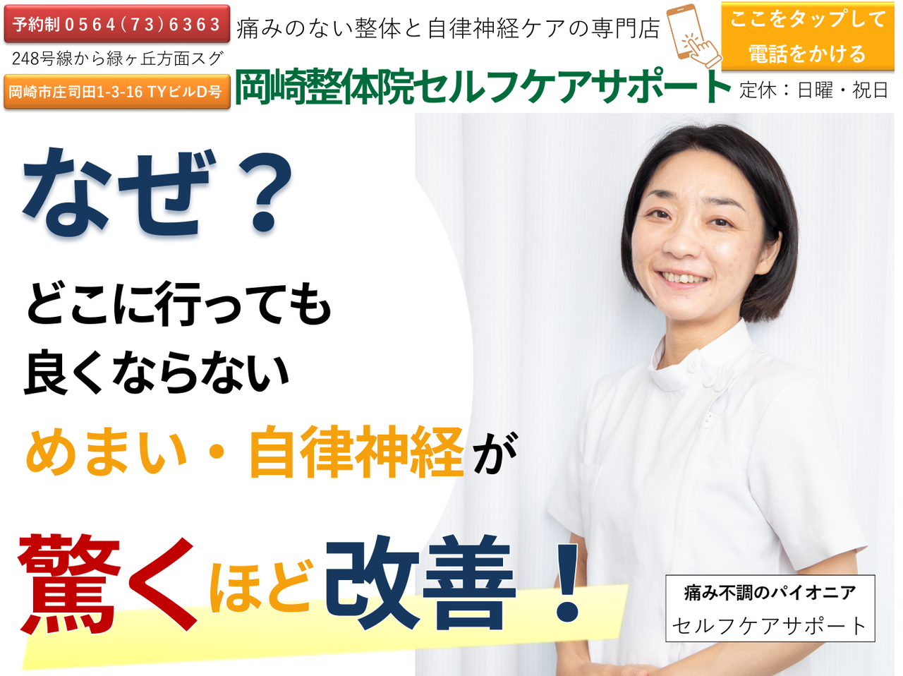 岡崎市の整体院|痛みと自律神経の専門家。頭痛、肩こり、腰痛、顎関節、更年期、産前産後、女性特有の慢性症状 あなたのお悩み聞かせて下さい