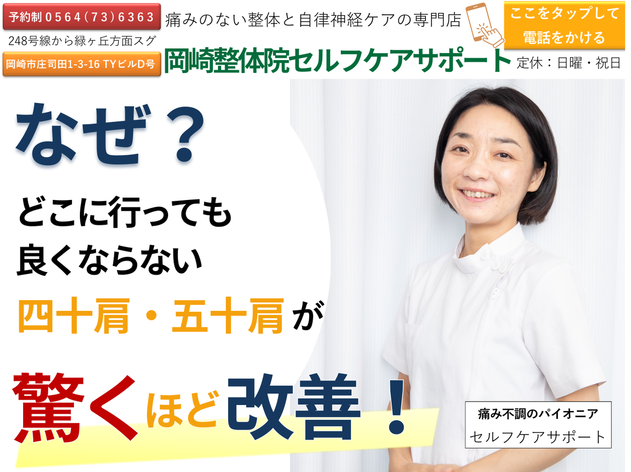 岡崎市の整体院|痛みと自律神経の専門家。頭痛、肩こり、腰痛、顎関節、更年期、産前産後、女性特有の慢性症状 あなたのお悩み聞かせて下さい